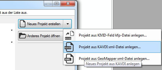 Im grafischen Feldbuch FX S-Kataster wird die aus KAVDI exportierte Schnittstellendatei direkt zur Erstellung eines Projektes verwendet.
