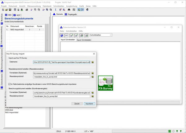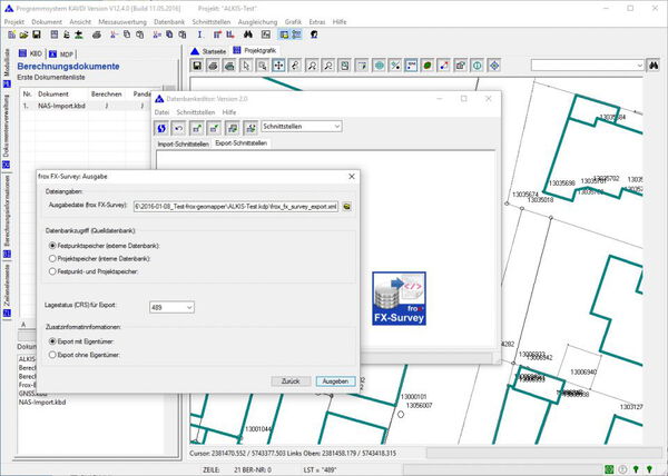 Die mit FX S-Kataster erfassten Messdaten können anschliessend in KAVDI mit den bekannten Werkzeugen ausgewertet, berechnet, ausgeglichen, für ALKIS qualifiziert und die Abläufe protokolliert werden.