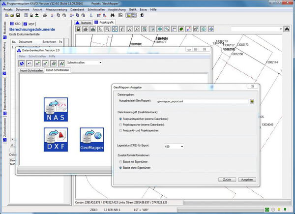 Die Schnittstelle ermöglicht es, einen KAVDI Datenbestand (z.B.: ALKIS-Bestandsdaten) für das geodätische CAD rmDATA GeoMapper zu exportieren. Der Export der punktförmigen und flächenhaften Objekte und das Importieren erfolgt in einem Arbeitsschritt. Das Ergebnis wird je nach eingestellter GeoMapper-Konfiguration visualisiert. Optional können die nach einem KAVDI Berechnungslauf bestimmten Punkte und Linien online in rmDATA GeoMapper übertragen werden, so dass das Berechnungsergebnis direkt im CAD zur weiteren Bearbeitung zur Verfügung steht.
