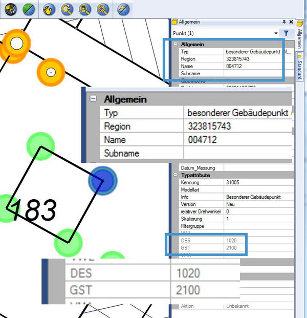 Die Objektarten der punktförmigen bzw. flächenhaften Objekte, die Genauigkeitsstufen der Punktorte und weitere Informationen wie z.B. Eigentümerinformationen werden verarbeitet und dienen dann im rmDATA GeoMapper zur detaillierten Ausgestaltung.